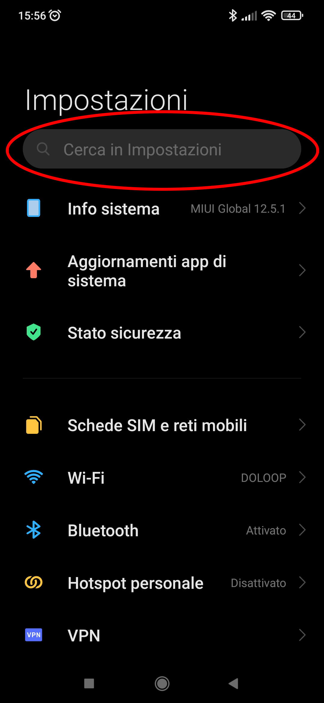 Aprite le impostazioni del vostro Smartphone e cliccate su "Cerca in impostazioni".