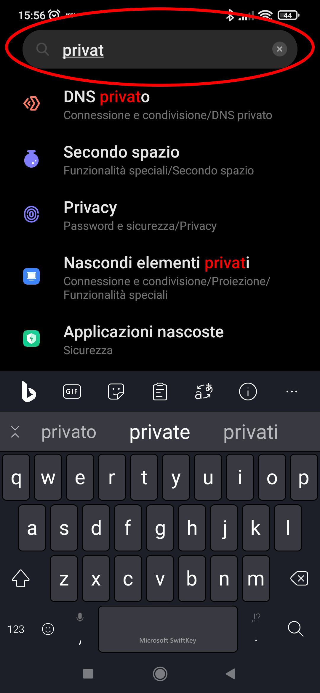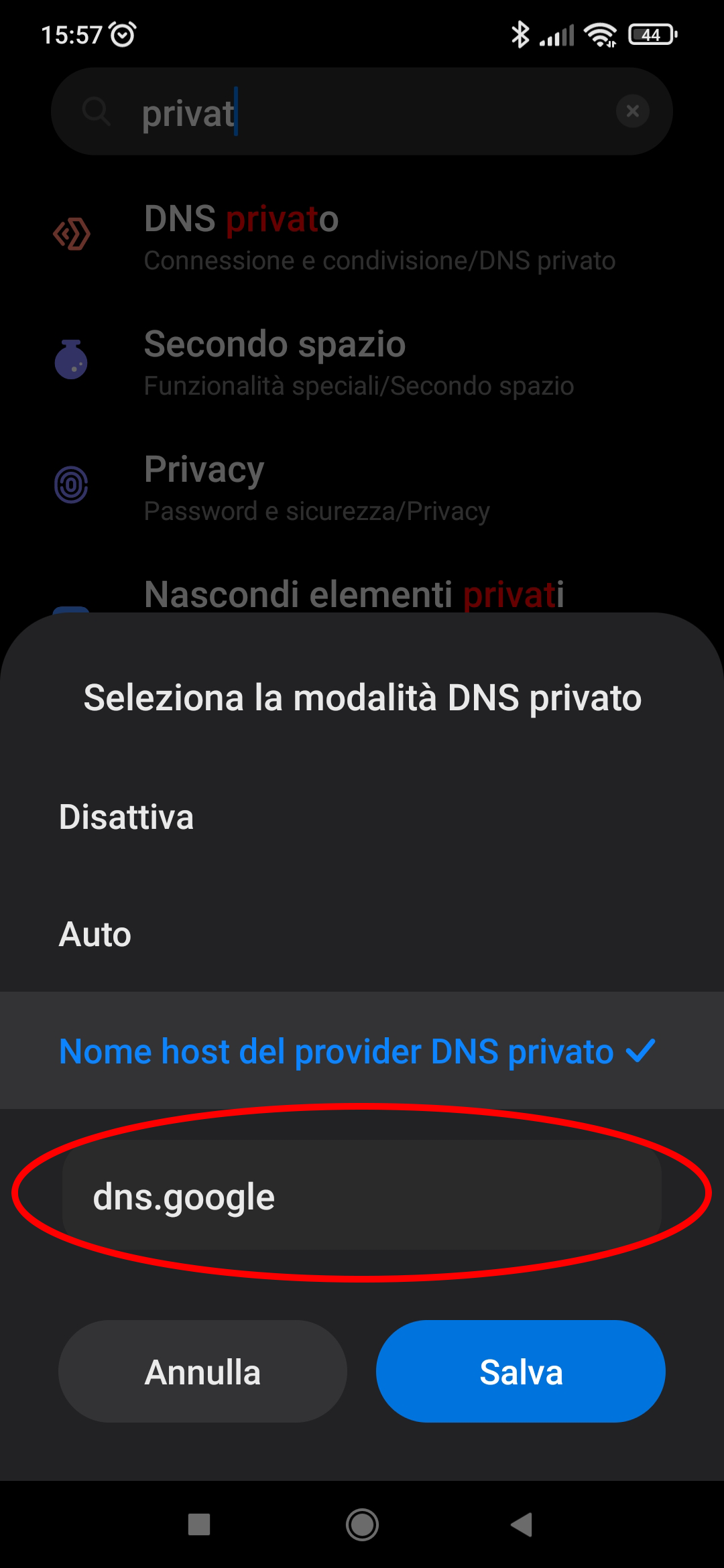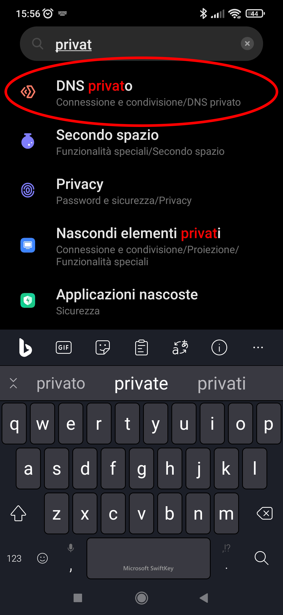 Iniziate a digitare la parola "privato" finchè non apparirà "DNS privato" o "Private DNS"